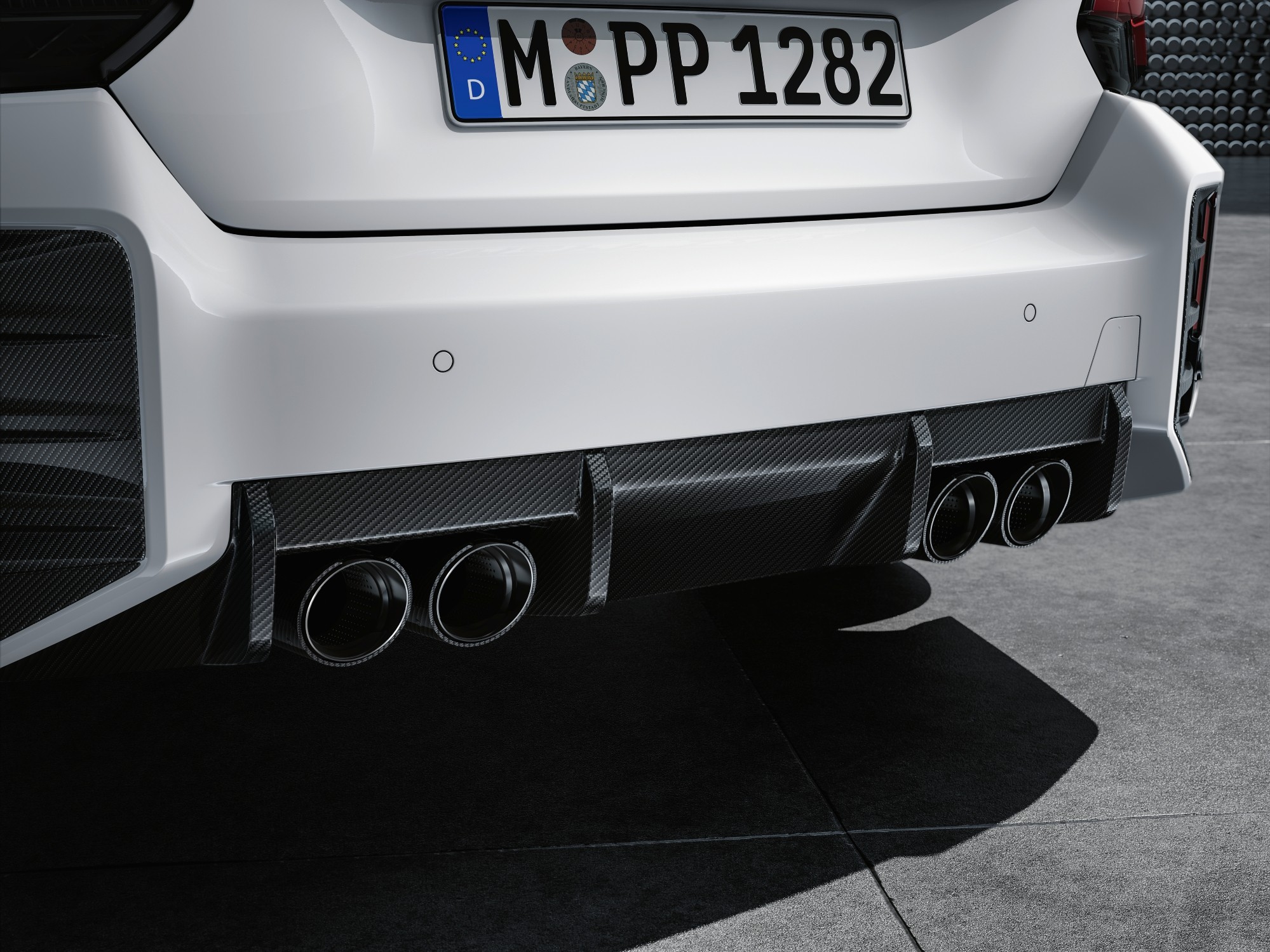 Titanový tlumič výfuku M Performance, který je k dispozici pro nové BMW M2, je lehčí, nepřehlédnutelný a nelze jej přeslechnout. Jeho přední část je vyrobena z lehké nerezové oceli, zatímco zadní tlumič je kompletně z titanu. Oproti standardnímu dílu činí úspora hmotnosti osm kilogramů. Výfukový systém s elektricky ovládanými klapkami a centrálně umístěnou čtveřicí koncovek je nabízen v kombinaci se speciálně upraveným karbonovým difuzorem M Performance. Modifikované vedení výfukových plynů vytváří ještě sportovnější jízdní zážitky. Zvukový projev se mění podle zvoleného jízdního režimu a v režimech Sport a Sport+ připomíná závodní vozy. Jako poutavý doplněk pro standardní výfukovou soustavu nového BMW M2 jsou k připraveny koncovky výfuku M Performance kombinující materiály jako je titan a karbon.