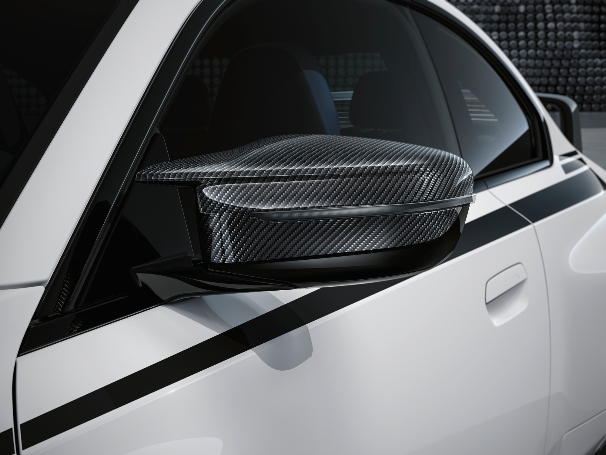 Přídavné karbonové díly pro přední, boční a zadní část zlepšují aerodynamické vlastnosti vozu a zároveň zdůrazňují jeho závodní auru díky bezbarvému laku, který odhaluje uhlíková vlákna pod ním. Přední karbonový splitter M Performance a karbonové M Performance obložení nasávacích otvorů dodávají novému BMW M2 obzvláště výrazný vzhled. Zákazníci, kteří si přejí dodat bočnímu profilu vozu ostřejší vizuální nádech, mají na výběr karbonové nástavce bočních prahů M Performance, karbonová boční křidélka M Performance pro přední i zadní část, případně M karbonové kryty vnějších zpětných zrcátek. Proudění vzduchu kolem vozu lze vylepšit a estetiku zvýraznit na maximum následujícími karbonovými M Performance prvky: odtrhovou hranou na víku zavazadlového prostoru, případně velkým křídlem a karbonovým difuzorem. Leskle černý aerodynamický prvek na horní hraně zadního okna je dalším nezaměnitelným doplňkem. Exteriér vozu je možné doplnit M Performance tažným okem nebo aramidovým krytem antény.