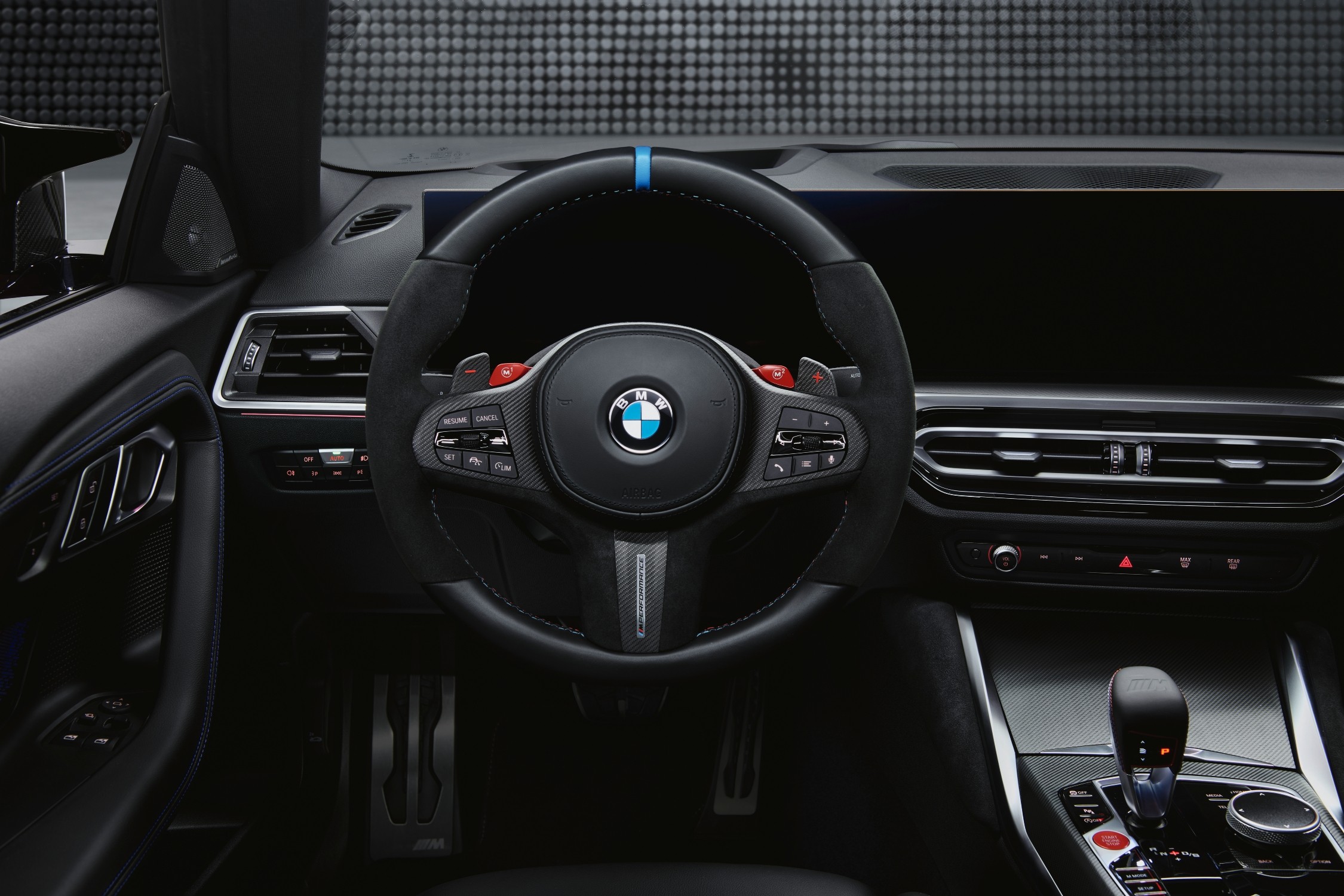 Volant M Performance Pro má výrazně tvarovanou oblast úchopu čalouněnou Alcantarou a jeho zploštěné horní a dolní části jsou potaženy kůží nejvyšší kvality. Úžasný vzhled volantu dotváří středová značka a ozdobné prošívání v barvách BMW M GmbH. Obložení volantu M Performance, která jsou k dispozici v provedení karbon/Alcantara a karbon/kůže, představují další cestu pro posílení radosti z jízdy. Obě varianty lze také kombinovat s karbonovými M Performance řadicími páčkami. V nabídce nechybějí ani karbonové kryty prahů M Performance.