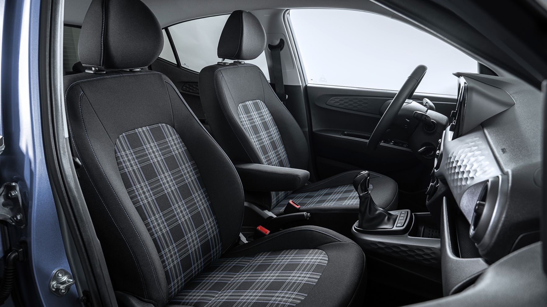 V interiéru je nový Hyundai i10 vybaven modrým ambientním osvětlením v prostoru předních sedadel. K dispozici budou 4 různé barevné kombinace interiéru. Klasický černý interiér kombinuje černé látkové čalounění sedadel s jednobarevnou přístrojovou deskou, Zatímco šedý interiér, dostupný ve vyšších stupních výbavy, nabídne světle šedé čalounění sedadel s přístrojovou deskou, jejíž horní část je černá a spodní část šedá.