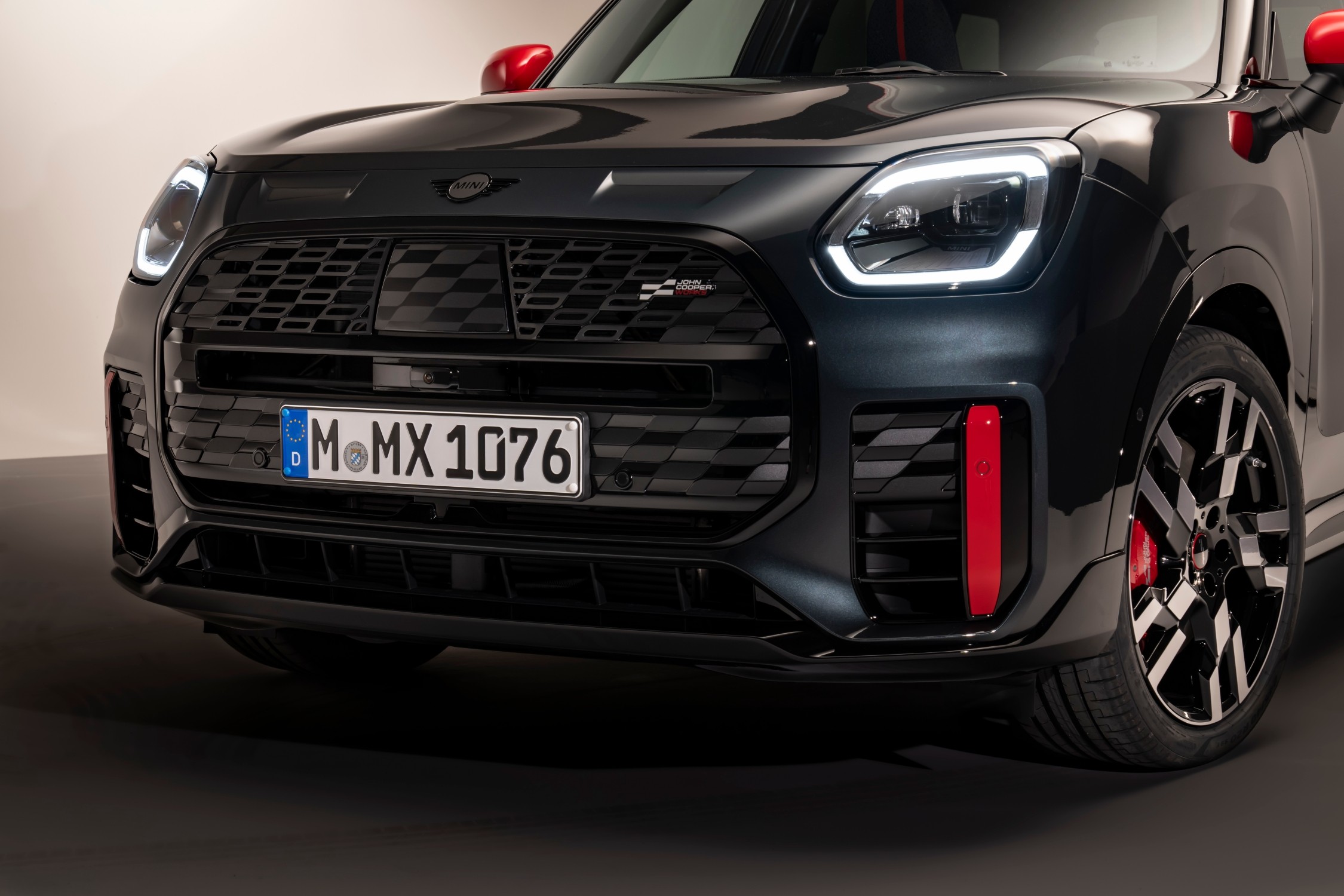 Nové MINI John Cooper Works Countryman se vyznačuje rázným a sportovním vzhledem, který odráží jeho dynamické vlastnosti a všestrannost. Exteriér zaujme řadou pro tento model specifických prvků, které umocňují jeho celkový vzhled. Například aerodynamické prvky s vertikálními odrazkami na přední části vozu zdůrazňují jeho širokou karoserii, zatímco nové MINI LED světlomety s horizontálními pruhy v režimu JCW Signature dodávají tomuto crossoveru ještě expresivnější celkový výraz. Přední část se vyznačuje také nově navrženou osmiúhelníkovou leskle černou maskou chladiče a nově navrženým tříbarevným logem JCW.