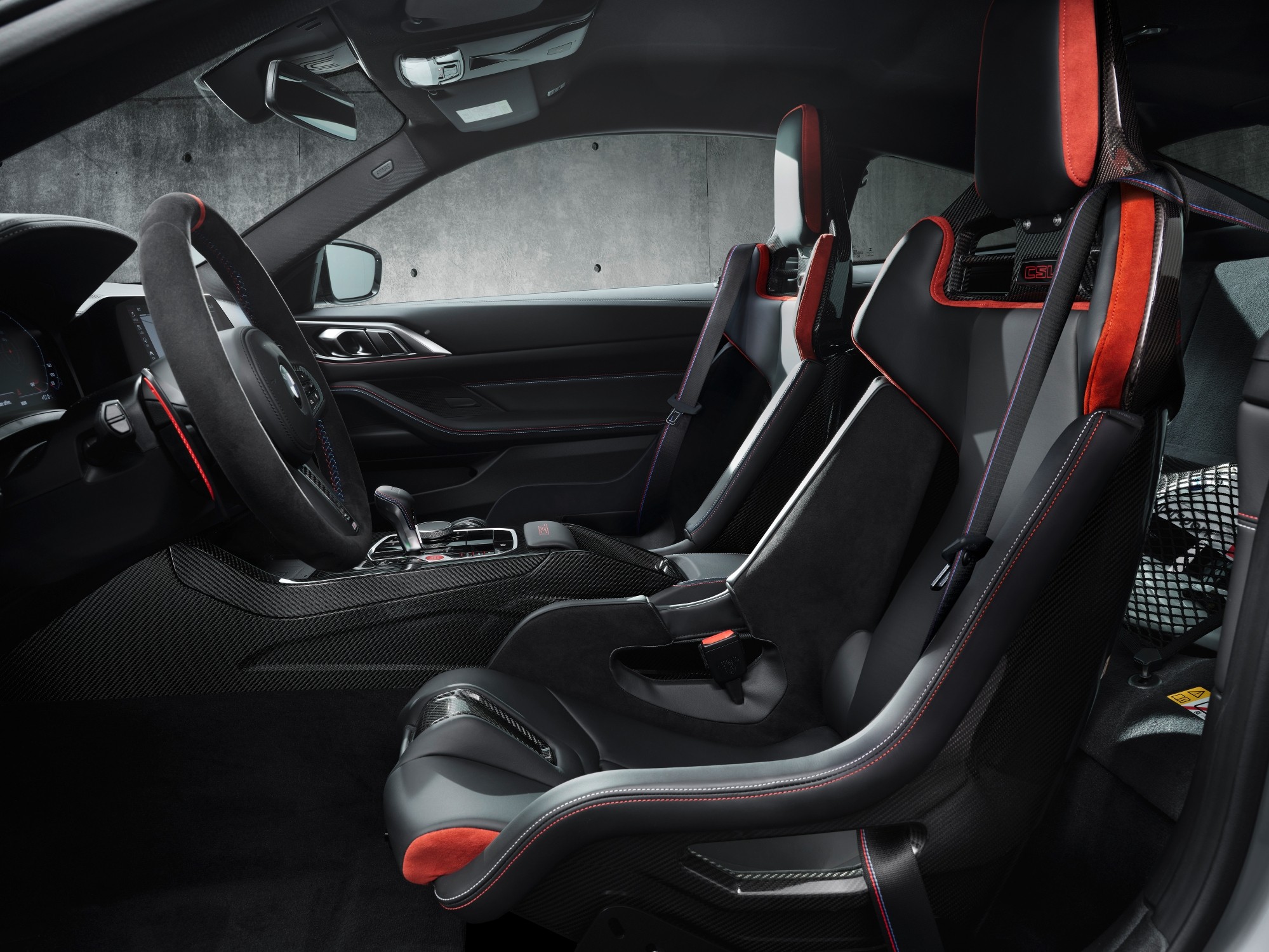 Specifické prvky výbavy modelu BMW M4 CSL se vyznačují osobitým vyvážením mezi ryzostí sportovního vozu, neomezenou každodenní použitelností a exkluzivní prémiovostí. M karbonová celoskořepinová sedadla řidiče a spolujezdce se vyznačují samonosnou strukturou z CFRP a záměrnou absencí komfortních prvků. Opěradlo má pevně daný sklon, podélný posuv lze měnit manuálně a výšku sedadla je možné upravovat pouze v dílně pomocí šroubováku ve třech úrovních. M karbonová celoskořepinová sedadla mají také odnímatelné opěrky hlavy a umožňují instalaci šestibodových bezpečnostních pásů.