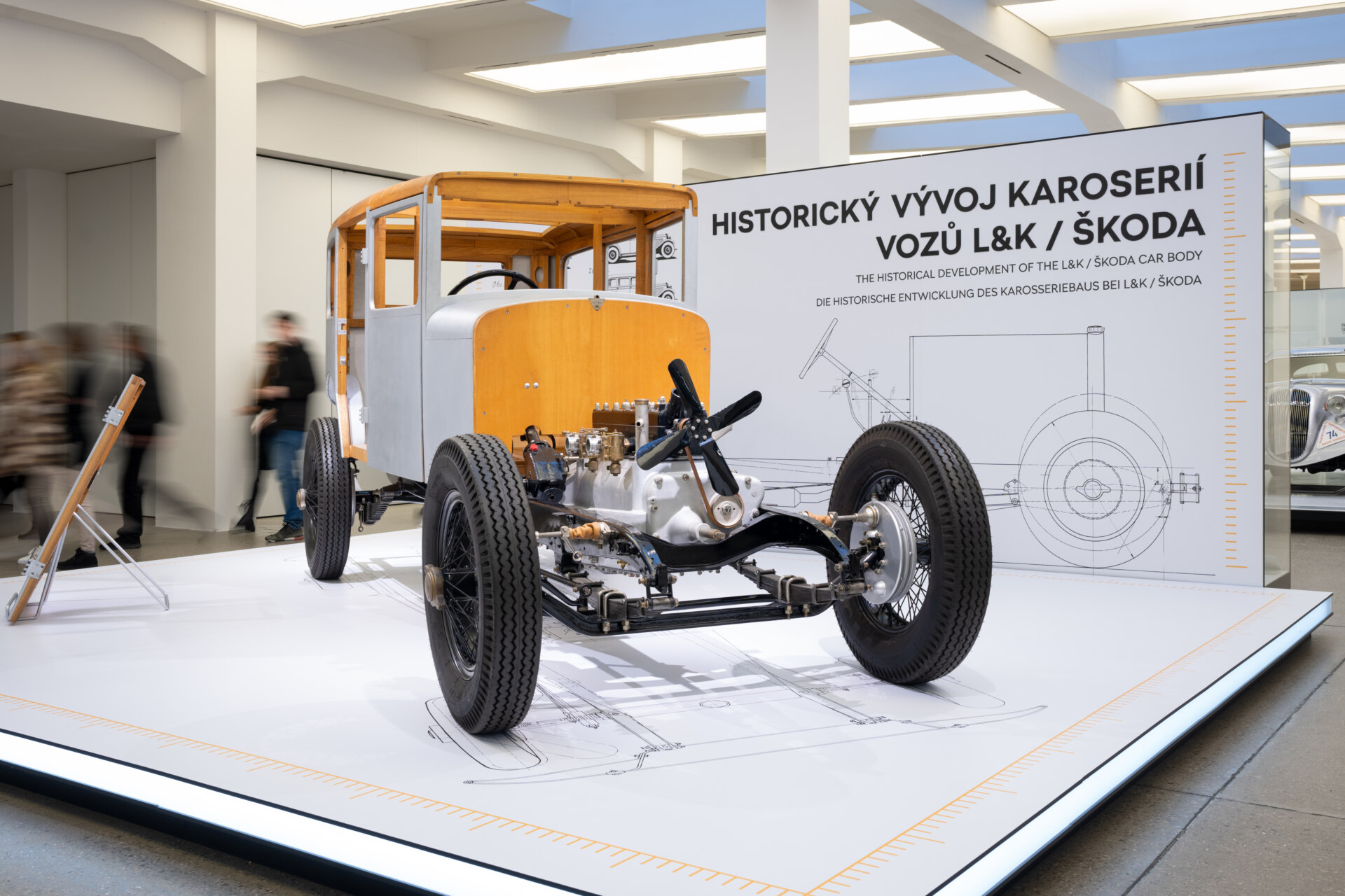 Příběh vývoje karoserií vyprávějí čtivé průvodní texty a leckdy úsměvné fotografie dávných prototypů i pohledy do „kuchyně“ řady profesí. Vývojovou linii reprezentují historická vozidla doplněná multimediálními infopanely. K vidění je ŠKODA 6R z roku 1929 s ukázkou výdřevy karoserie nebo ŠKODA RAPID OHV (1940) s první praktickou aplikací měření v aerodynamickém tunelu. Oko potěší také ladně zaoblené linie celokovových karoserií sedanu ŠKODA 1200 (1954) a servisního vozu ŠKODA 1201 STW (1958). Rostoucí důraz na posilování bezpečnostní úrovně demonstruje ŠKODA 100 (1973) s tlačným zařízením používaným před 50 lety při prvních crash testech. Aktuální produkci zastupuje názorný řez karoserií vozu ŠKODA OCTAVIA (2020). Výstava „Jak vzniká automobil v proměnách času: Historický vývoj karoserií vozů L&K/ŠKODA“ bude k vidění do 8. května 2023.
