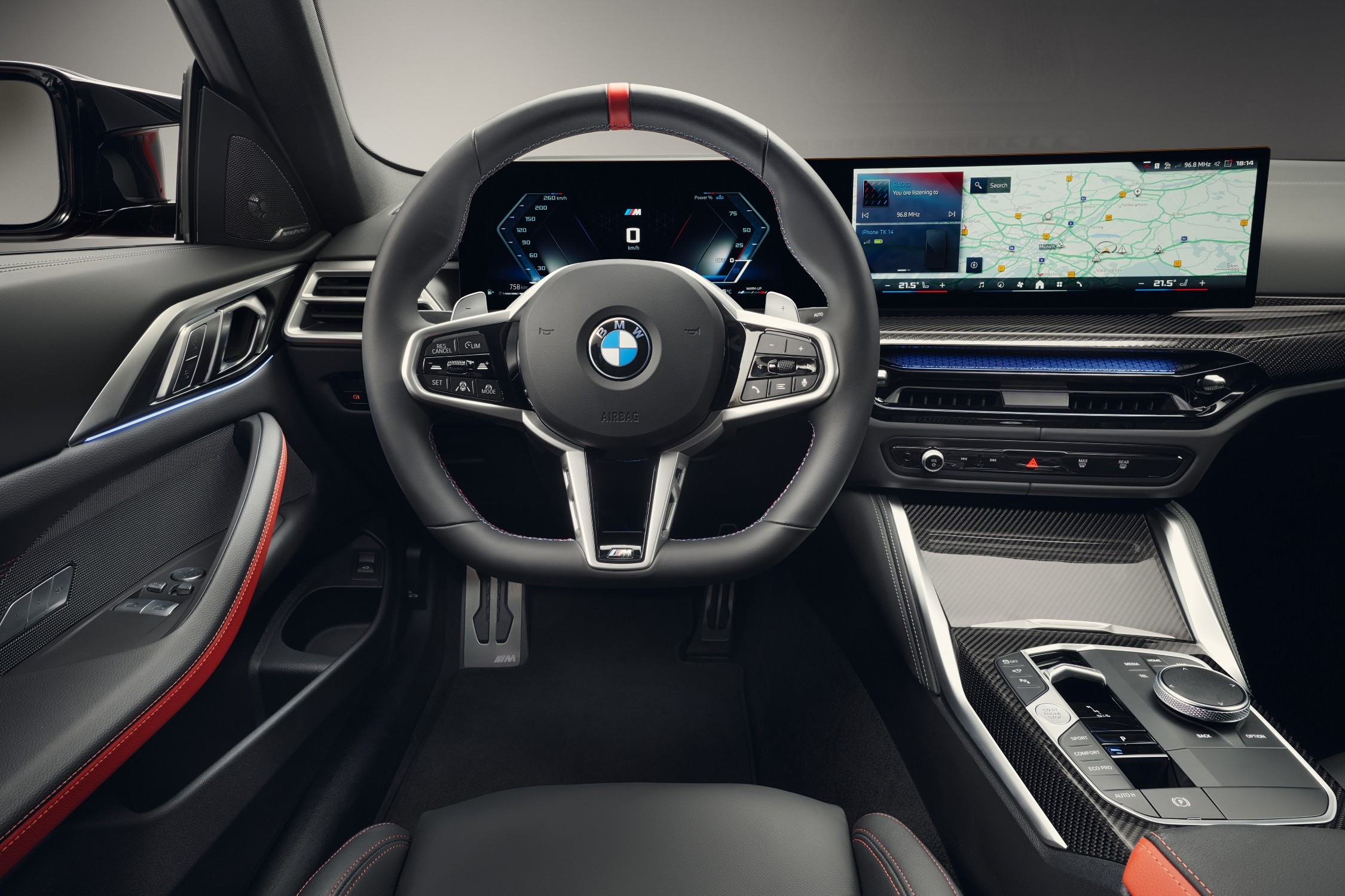 Sportovní atmosféru ve vrcholných modelech umocňuje nové provedení M koženého volantu. Jeho věnec s plochou spodní částí, červeným středicím proužkem a kontrastním prošíváním v barvách BMW M GmbH přispívá k ještě intenzivnějšímu zážitku z jízdy s M Performance modely nového BMW řady 4.