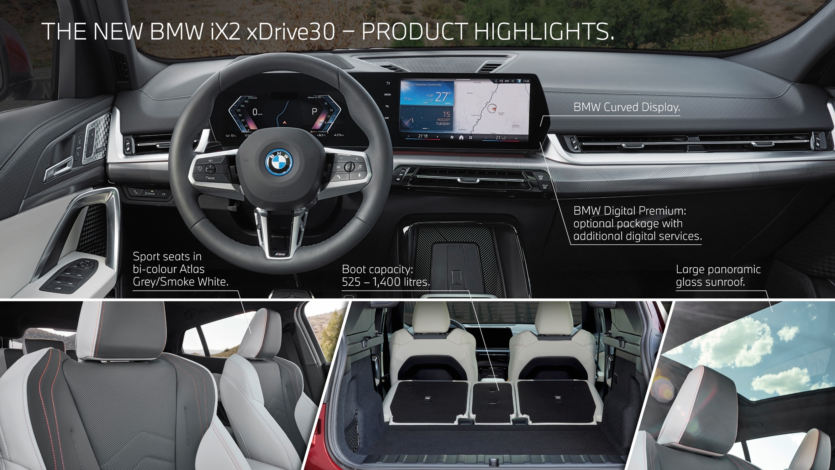 Dvouzónová automatická klimatizace, navigační systém BMW Maps a sportovní kožený volant jsou v novém BMW X2 součástí standardní výbavy, stejně jako automatické ovládání víka zavazadlového prostoru, čtyři porty USB-C a 12V zásuvka ve středové konzole i v zavazadlovém prostoru. Oproti předchozímu modelu se také výrazně zvýšil počet dostupných asistenčních systémů a digitálních služeb.