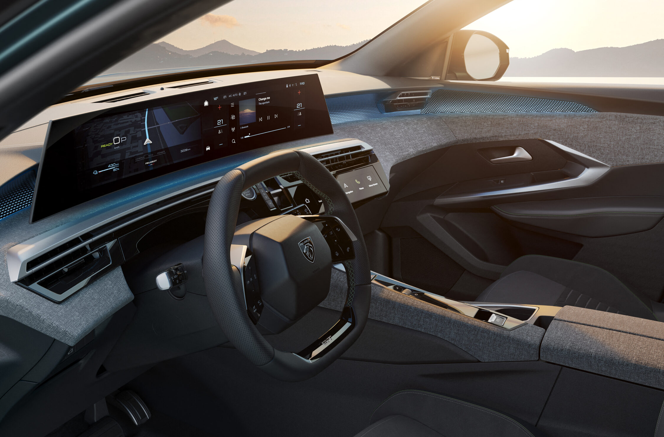 Kromě velkolepé 21palcové plovoucí panoramatické obrazovky nového systému Peugeot Panoramic i-Cockpit® umocňuje atraktivitu a technologický charakter kabiny ambientní LED osvětlení, které lze přizpůsobit dle přání uživatele v osmi různých barvách. Toto osvětlení se odráží v elegantním obložení z hliníku, které sahá po celé šířce palubní desky a výplní dveří. Spojení hliníku, světla a látkového obložení vytváří jedinečnou a efektní kombinaci kvalitních materiálů.