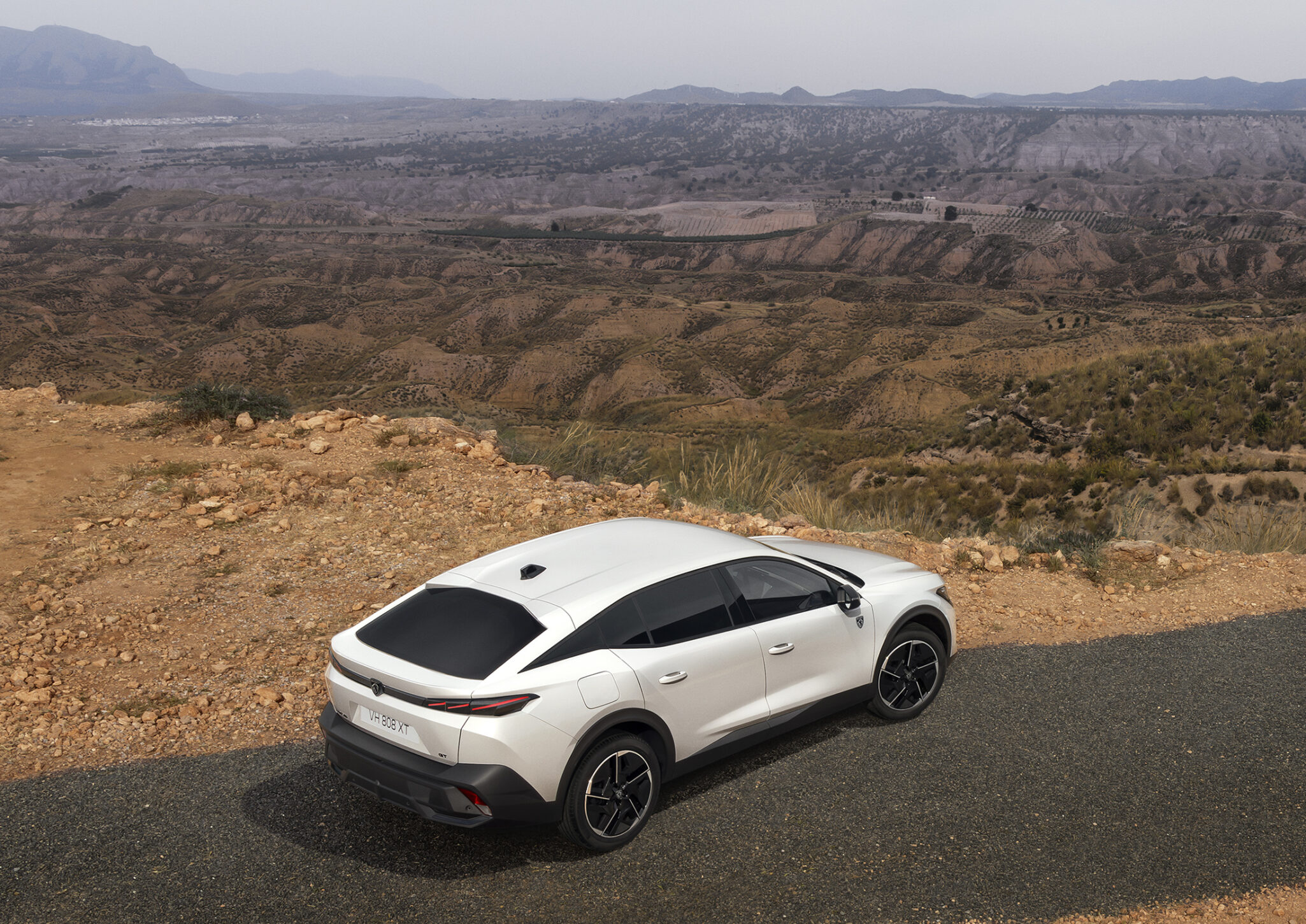 Peugeot E-408 poskytuje díky širokému rozchodu kol – 159 cm vpředu a 160 cm vzadu – mimořádnou stabilitu. A přestože je tento model zvýšený (výška 149 cm), nabízí štíhlý a sportovní profil a optimalizovanou aerodynamiku.