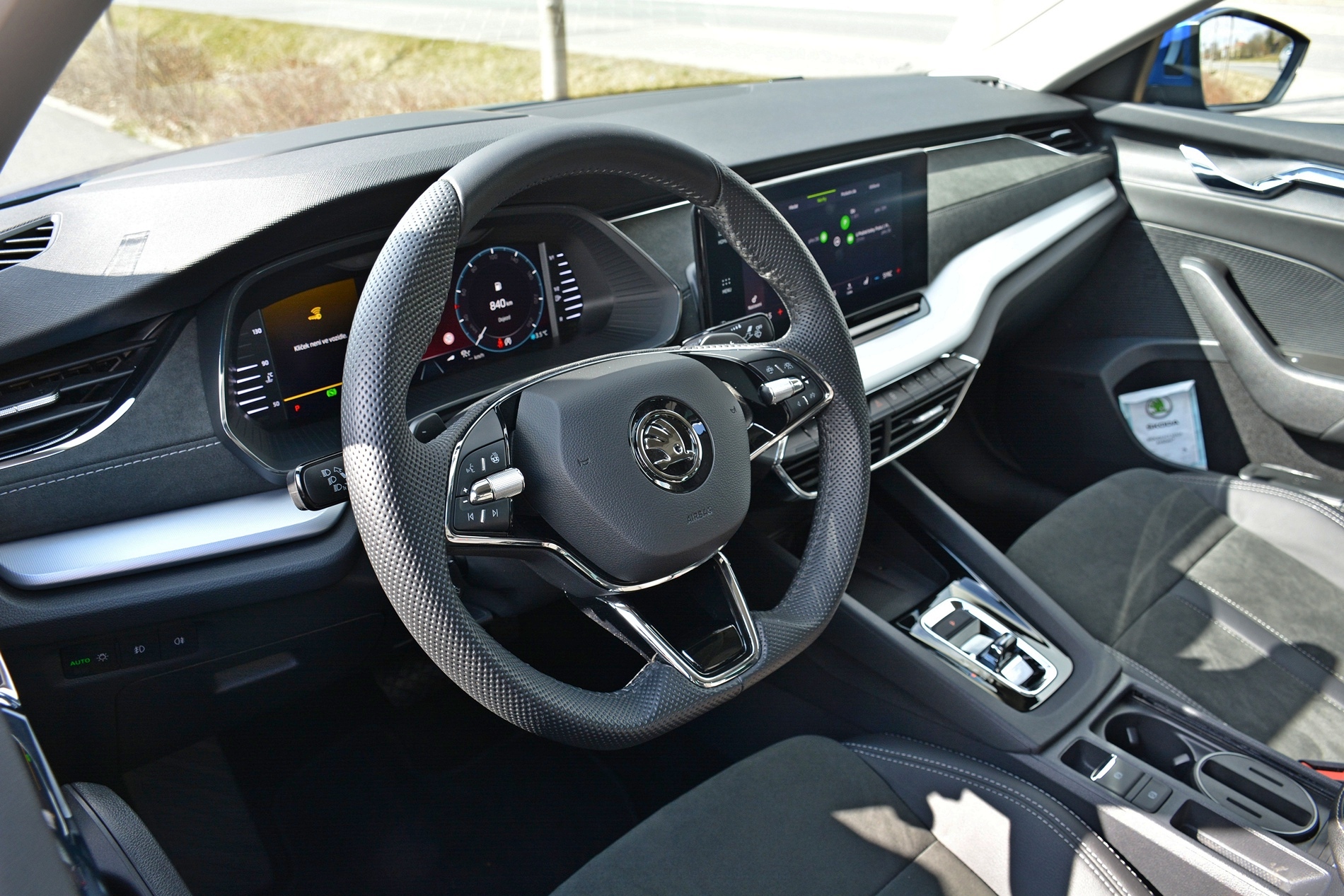 V kabině je na první pohled vše nové, interiéru dominuje centrální displej. Já jsem chvíli tápal s ovládáním, par okamžiků mi trvalo, než jsem si osahal všechny ovladače a nalezl všechny funkce, dlouho mi trvalo, a bez pomoci bych to nezjistil, než jsem se naučil používat stříbrná tlačítka na volantu. Bez rady bych asi doteď nevěděl, jak si na přístrojové desce zobrazím hodnotu dojezdu.
