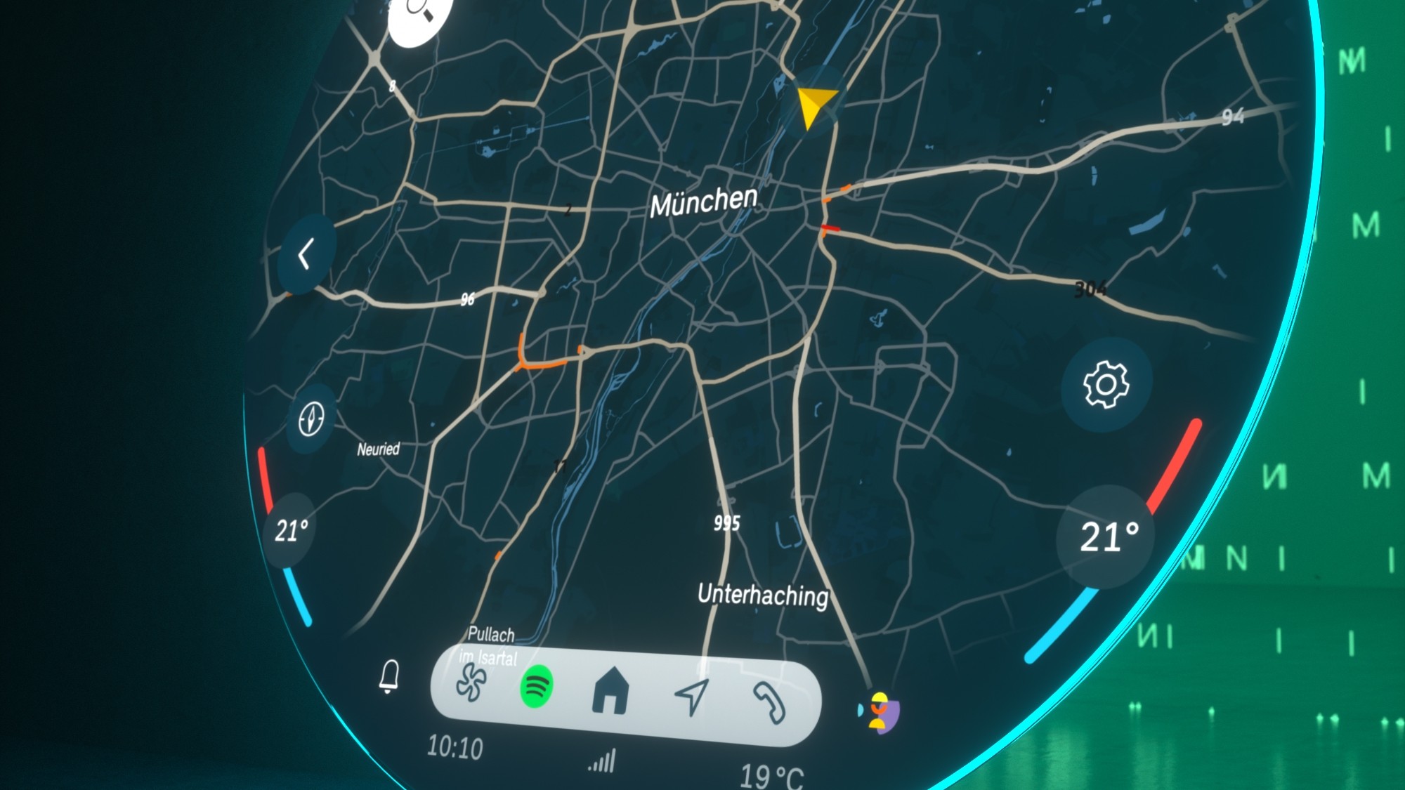 Uprostřed displeje je umístěno hlavní menu, na němž lze vybrat a spustit přizpůsobený obsah přejetím prstem do strany. Ve spodní části displeje se nachází lišta obsahující položky „Navigace“, „Média“, „Telefon“, „Všechny aplikace“ a v závislosti na okolnostech i tlačítko „Domů“. Přejetím prstem od spodního okraje displeje nahoru se objeví panel nástrojů, což je úkon, který zákazníci znají z mnoha zařízení spotřební elektroniky. Sem je možné uložit oblíbené funkce a připravit je tak pro jejich rychlou volbu. Umístit sem lze například cíle navigace či rozhlasové stanice. Tuto lištu lze aktivovat také pomocí tlačítka s hvězdičkou na multifunkčním volantu. Horní část displeje je vyhrazena pro údaje důležité pro jízdu, jako je například rychlost jízdy nebo informace o stavu vozu. Volitelný Head-up displej zobrazuje nejdůležitější informace do zorného pole řidiče.