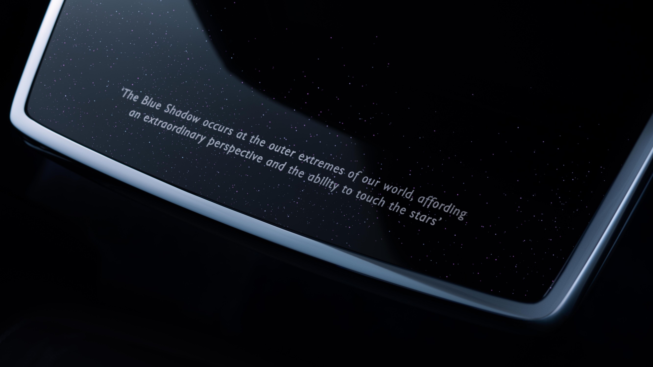 Na Kármánově linii se viditelný okraj zemské atmosféry jeví jako modrá svatozář. Tento přechod z modré oblohy do temnoty vesmíru je zachycen na jedinečném lakovaném panelu palubní desky a dveřních výplních modelu Blue Shadow. Ty byly vytvořeny pomocí šesti vrstev laku, které kombinují pět modrých odstínů s hlubokým černým nádechem, aby vytvořily fascinující trojrozměrný efekt. Vše je zakončeno čirou vrstvou obsahující modré a čiré skleněné částice, které laku dodávají další hloubku a lesk – poměr byl přesně definován až na zlomek procenta: je to přesně 0,05 %. Panel palubní desky je doplněn o hodiny z programu Bespoke, které jsou jedinečné pro Private Collection a obsahují světle modré eloxované detaily a vyrytý nápis Blue Shadow.