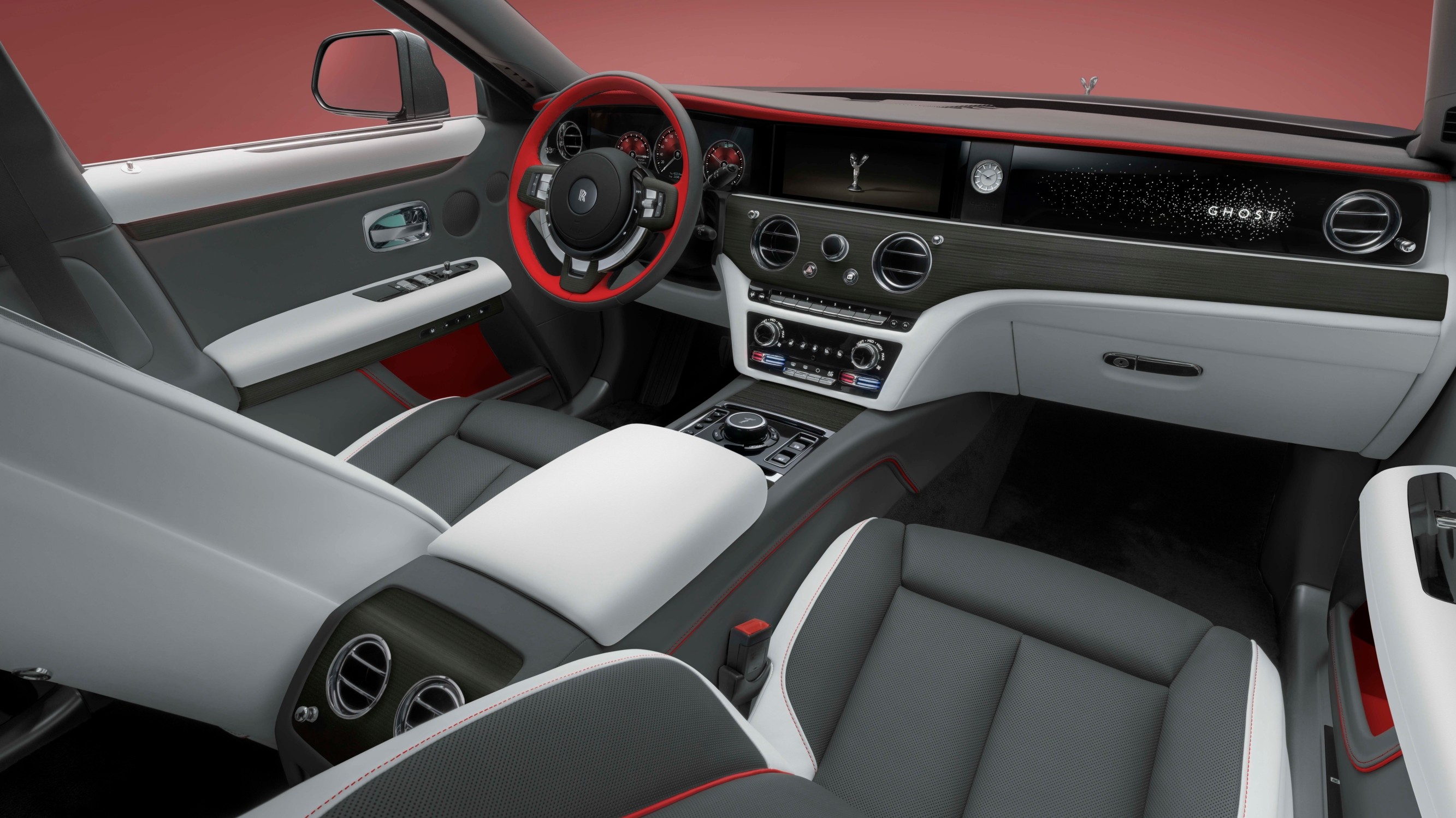 Klienti mají na výběr ze čtyř nápadných barev pro zvýraznění detailů – tyrkysovou Turchese, oranžovou Mandarin, žlutou Forge nebo červenou Phoenix. Tyto pestré odstíny doplňují zvolenou barvu exteriéru a vytvářejí žádoucí kontrast, který je ústředním bodem moderního pojetí designu. Zvolená barva pro zvýraznění je použita na nárazníku, brzdových třmenech a linii karoserie – jako decentní, ale jasně patrné pouto, které podtrhuje mechanické, aerodynamické a stylistické prvky modelu Ghost. Jemné záblesky nápadných barev se promítají i do interiéru vozu, včetně 1 040 barevných „hvězd“ v zakázkovém provedení prosvětleného stropu Starlight – každý svítící bod je individuálně zasazen v koženém perforovaném potahu. Nejprve jsou otvory precizně vyznačeny křídou a následně ručně vyraženy, aby kabinu naplnily jemnou září.