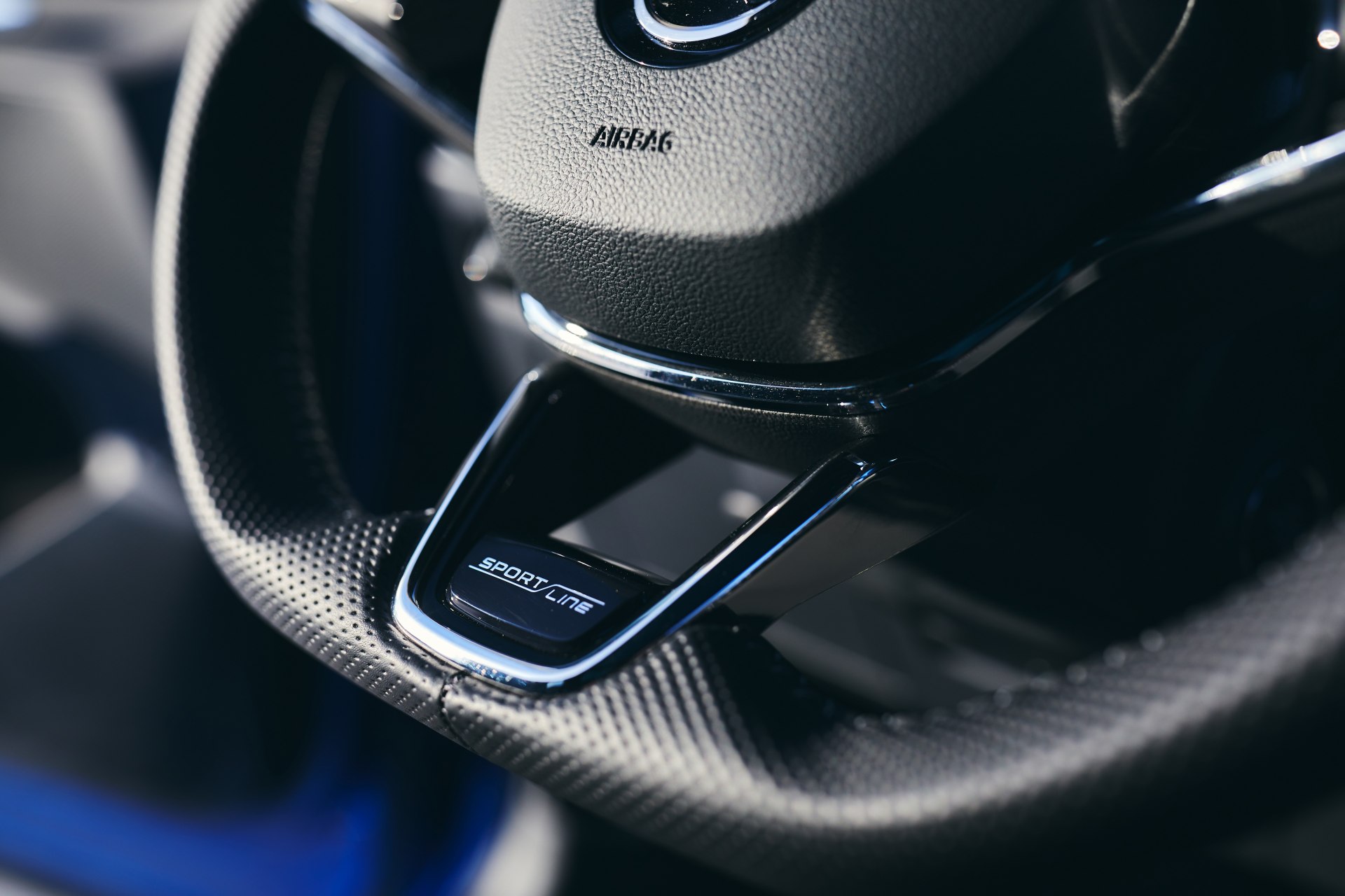 Tříramenný sportovní multifunkční vyhřívaný volant vozu ŠKODA ENYAQ SPORTLINE iV má nový design. Věnec volantu potažený kůží zdobí šedé kontrastní švy a spodní část volantu nese plaketu s nápisem SPORTLINE. Pomocí snadno přístupných tlačítek a otočných ovladačů lze na volantu nastavovat různé funkce. Stisknutím tlačítka na středové konzoli řidič aktivuje na 13″ displeji infotainmentu menu standardně dodávané volby jízdního režimu, která nabízí profily Eco, Comfort, Normal, Sport a Individual.