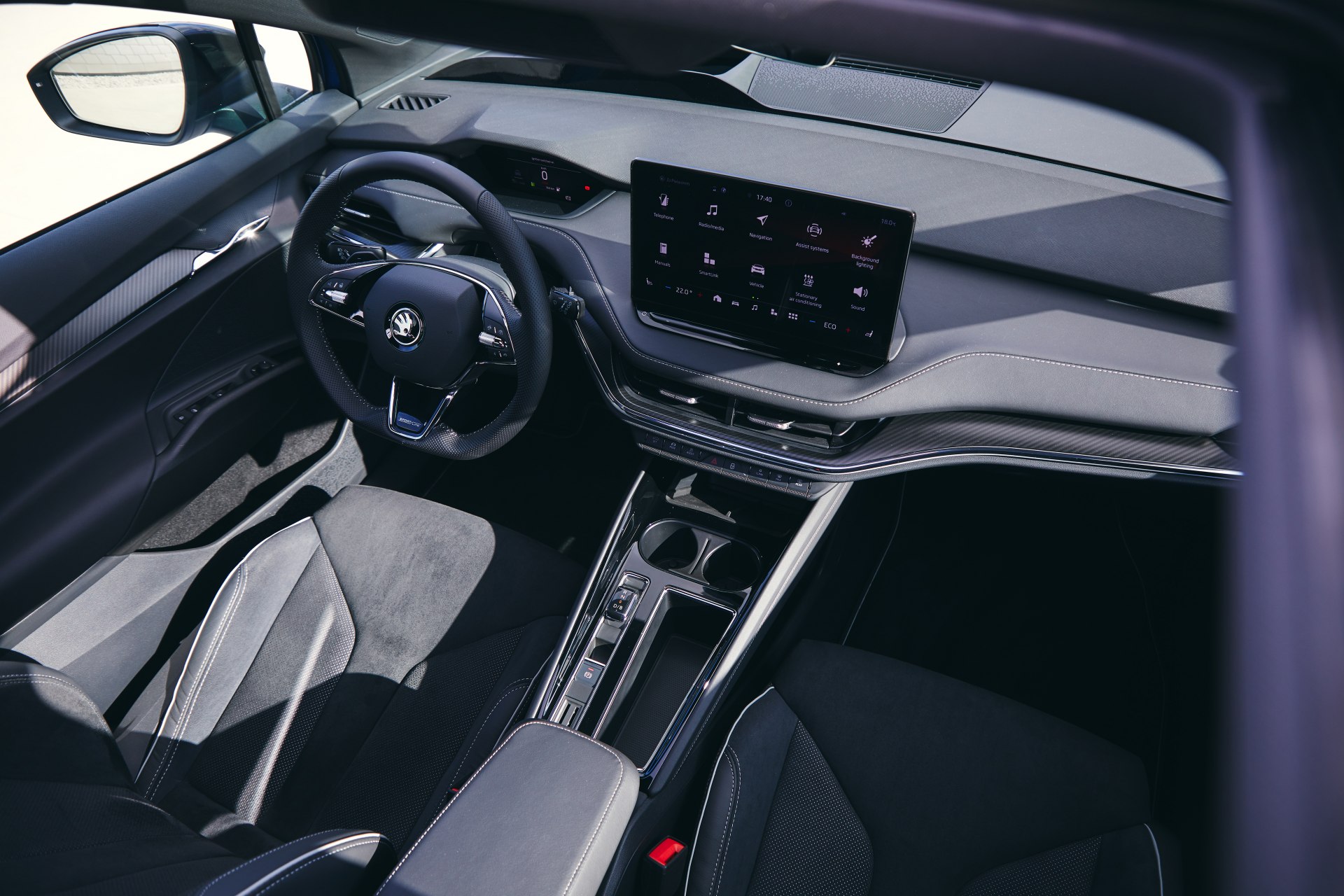 Interiér modelu ENYAQ SPORTLINE iV zdobí černé potahy a dekorační lišty v dekoru Carbon. Designy interiéru prvního elektrického SUV nahrazují klasické výbavové stupně a jednotlivé interiéry, které se inspirují světy moderního bydlení, nabízí vkusně sladěné barvy a materiály. Součástí specifického designu interiéru pro variantu SPORTLINE jsou černá přední sportovní sedadla s integrovanou hlavovou opěrkou, která zaručují za každé situace dobré boční vedení. Sedadla jsou potažena mikrovláknem Suedia a kůží, na předních sedadlech jsou pak doplněna šedou paspulí, tedy ozdobným lemováním. Vkládané textilní koberce jsou obšité nubukem v šedé barvě. Černý potah na přístrojové desce je vyroben ze syntetické kůže a černý je i strop interiéru. Dekorační lišty na přístrojové desce a ve výplni dveří jsou v dekoru Carbon. Obložení kolem voliče jízdy na středové konzoli a tlačítko elektromechanické parkovací brzdy mají černé provedení. Sportovní, dynamické akcenty dodávají interiéru také pedály s hliníkovými nášlapy.