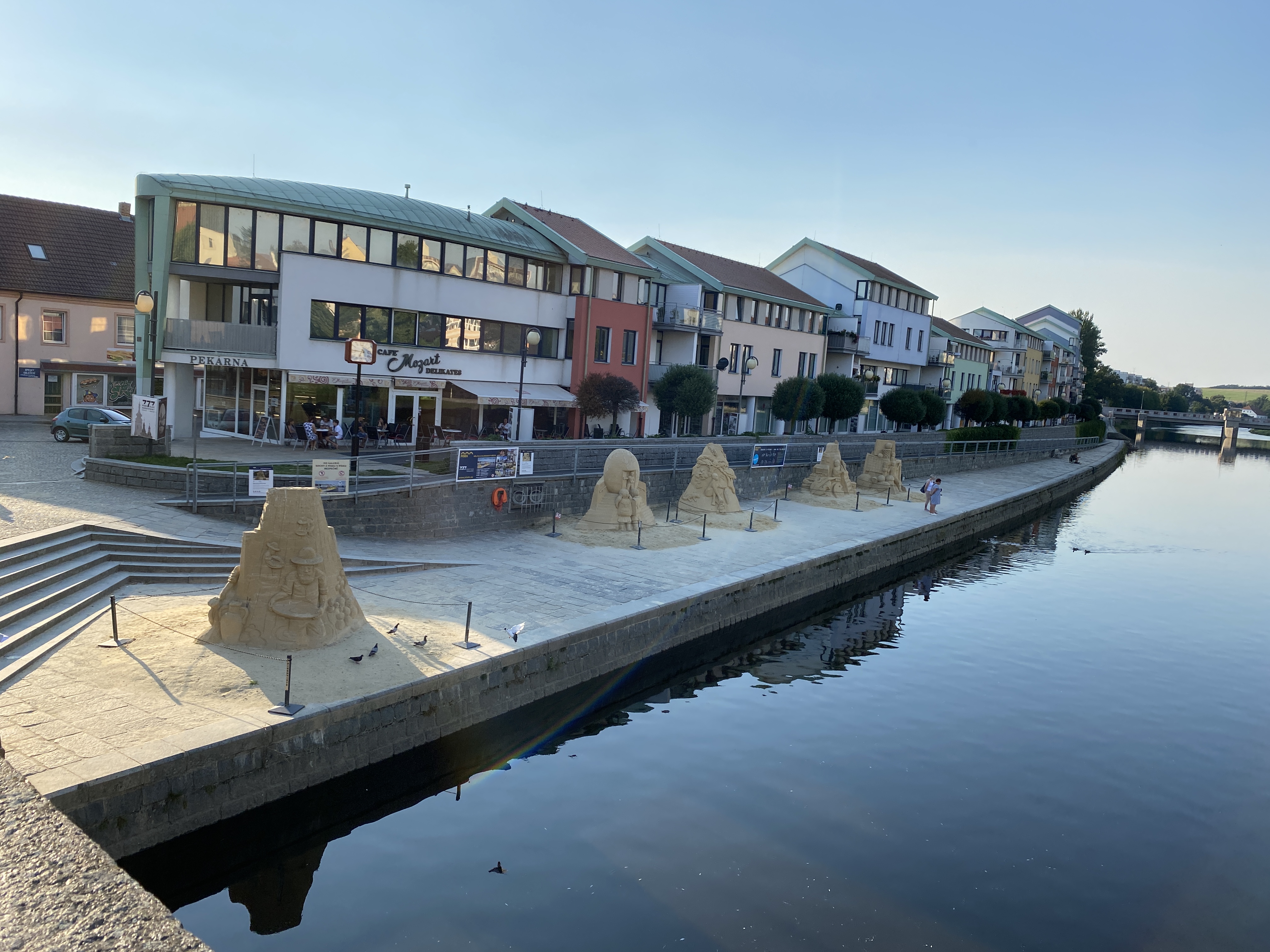 Písek je královské město na řece Otavě, přes kterou se klene kamenný most, nejstarší nejenom u nás, ale v celé střední Evropě. Město založil Přemysl Otakar II., myslím že letos je to 777 let, ale jsem nejenom špatný zeměpisec, ale i historik, tak mne neberte prosím za slovo. K mostu jsem zajel auto vyfotit. A najíst se, tentokrát do nedaleké „pivní“ restaurace. A také si prohlédnout sochy z písku, které jsou tradičně každý rok na nábřeží k vidění. Byly i letos. V Písku toho ale najde člověk daleko víc, třeba starobylý hřebčinec na kraji města, rozlehlý areál, který dává vzpomenout na dobu, kdy o koních pod kapotou v masovém měřízku nikdo ještě ani nesnil a základním dopravním prostředkem byl lichokopytník s výkonem právě jednoho koně.