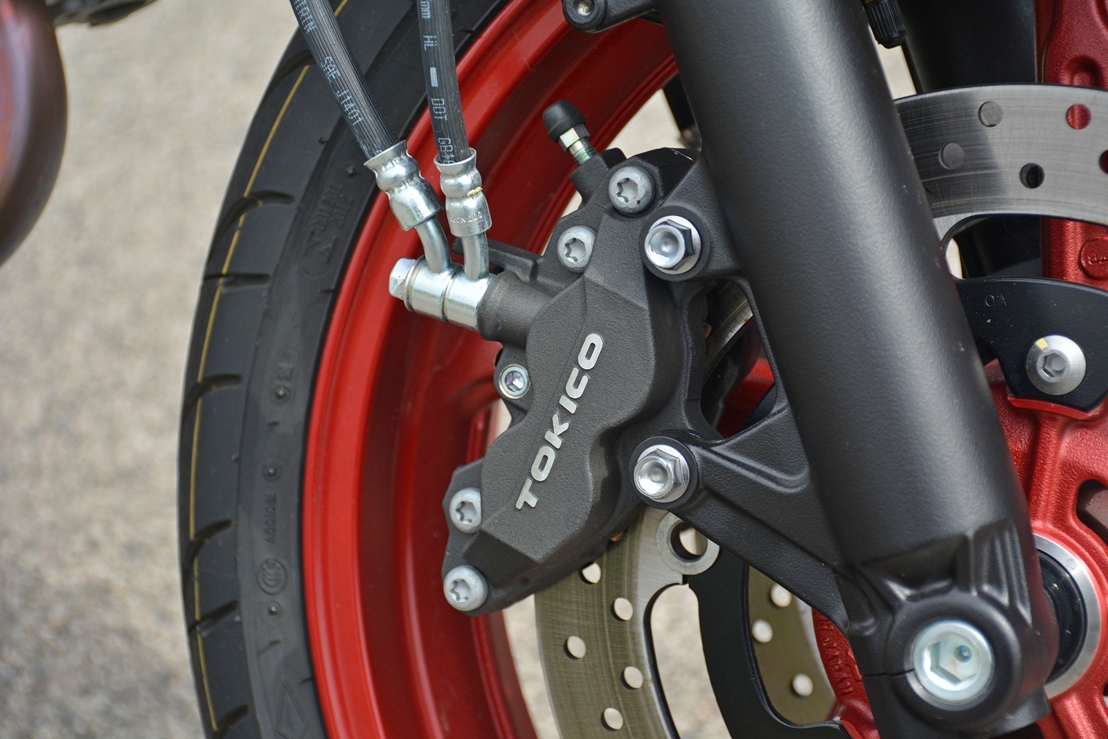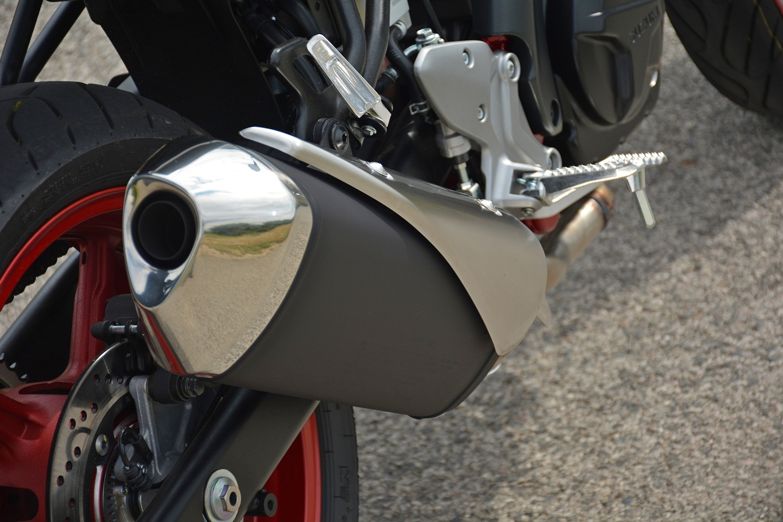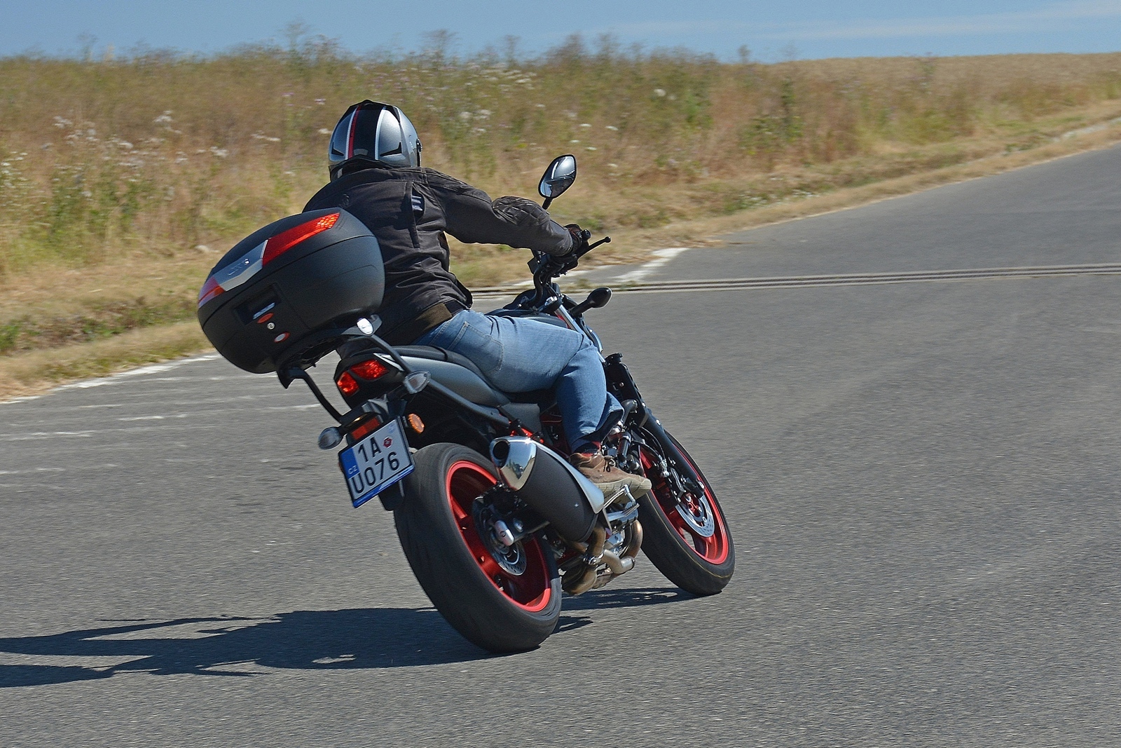 Zadní široká 160mm guma poskytuje opravdu velkou rezrevu, stejně tak přední 120mm. Průměrný jezdec se na úplný limit v běžném provozu moc často nedostane, ale ona to není zas taková ostuda mít na zadní gumě ten dvoucentimetrový „poserproužek“, který indikuje, že jezdec motorku tolik neklopí. Netrénovaný mozek prostě už motorku víc do zatáček rvát nechce a jen to ukazuje, kolik rezervy tahle povedená jednoduchá motorka poskytuje.