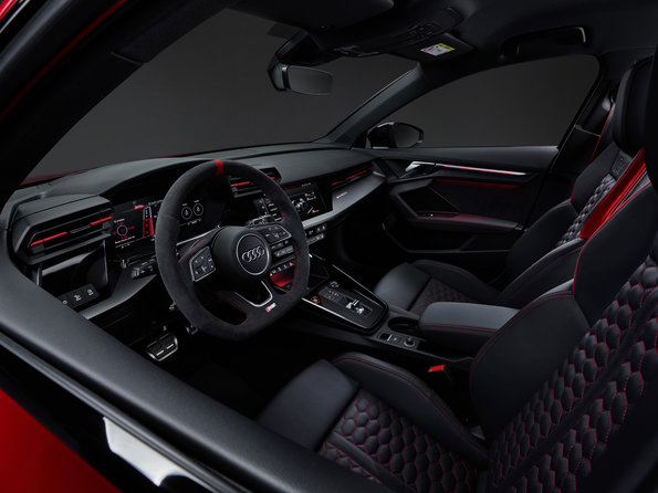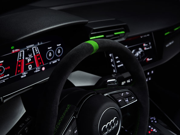 Specifický ukazatel řazení RS v režimu manuálního řazení zobrazuje otáčky podobně jako v motoristickém sportu od zelené přes žlutou až po přerušovaně svítící červenou, a tím informuje o ideálním okamžiku pro zařazení vyššího převodového stupně. Dotykový displej s úhlopříčkou 10,1 palce nabízí tzv. “RS Monitor”, v němž jsou ukazatele teploty chladicí kapaliny, motorového oleje a oleje v převodovce, jakož i tlaku v pneumatikách. Poprvé je pro Audi RS 3 k dispozici na přání také průhledový displej, který na čelní okno, přímo do zorného pole řidiče, promítá spolu s ukazatelem řazení další důležité informace.