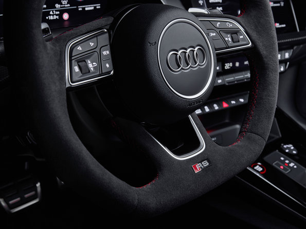 Model RS 3 je sériově vybaven tříramenným multifunkčním volantem RS Sport s dole zploštělým a kůží obšitým věncem. Volant nese velmi kvalitní páčky pro manuální řazení, vyrobené ze zinkových tlakových odlitků. Zákazníci, kteří se rozhodnou pro designový paket, obdrží kromě loga RS také vyznačení polohy 12 h pro rychlejší informaci o poloze volantu při dynamické jízdě. Alternativně je na výběr kruhový volant RS s kapacitním snímáním držení volantu pro funkce asistovaného řízení. Pro oba volanty je společné tlačítko RS Mode na pravém rameni. Jeho prostřednictvím může řidič aktivovat režimy systému řízení jízdní dynamiky Audi drive select: RS Performance, RS Individual nebo naposledy používaný modus. V obou režimech RS jsou zobrazované přístroje včetně na přání dodávaného průhledového displeje s ukazatelem řazení ještě sportovnější.